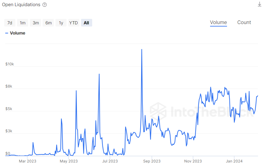This indicator shows the number of open positions and the corresponding volume pending to be liquidated. This information is useful to gauge the exposure and bad debt that the protocol could face.