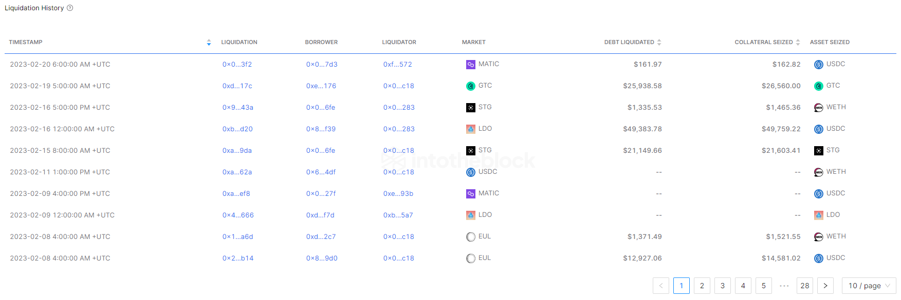 This indicator shows the record of all liquidations that have taken place in the Euler protocol over time. Liquidation links are the transaction hash, which can be seen in Etherscan block explorer. Borrowers are those getting liquidated, while liquidators are seizing their collateral assets.