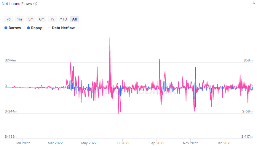 The Net Flows indicator goes over the inflows, outflows and debt netflows (borrows minus repayments) of the borrowing activity in the protocol.