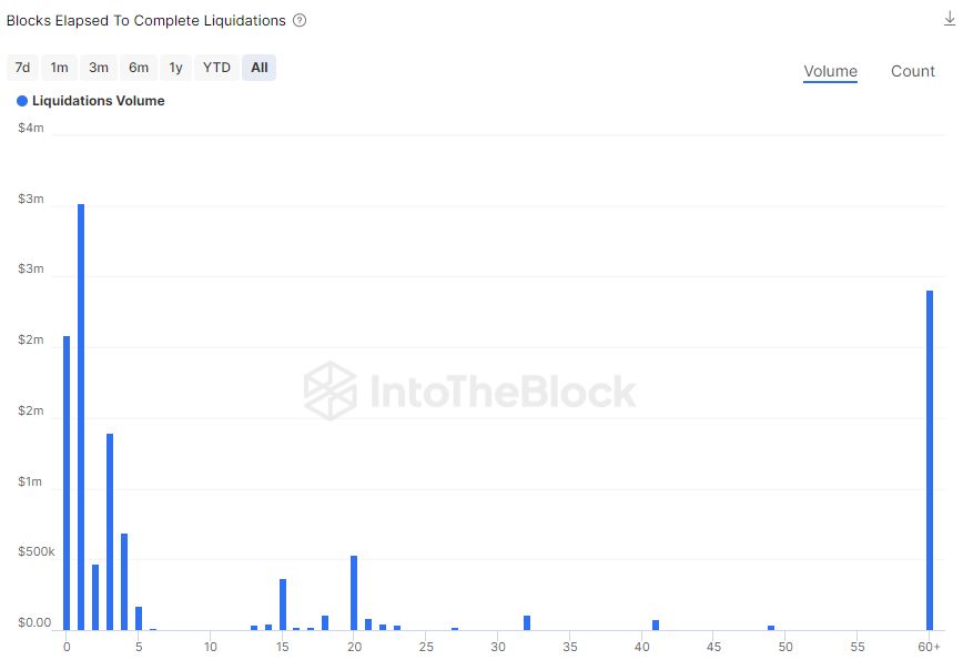 This indicator is useful to analyze the level of asset exposure that the protocol incurs when a liquidation opportunity arises. The more blocks the opportunity is open to liquidations, the greater the chances that collateral assets can go down in price and end up not being enough to repay debts.