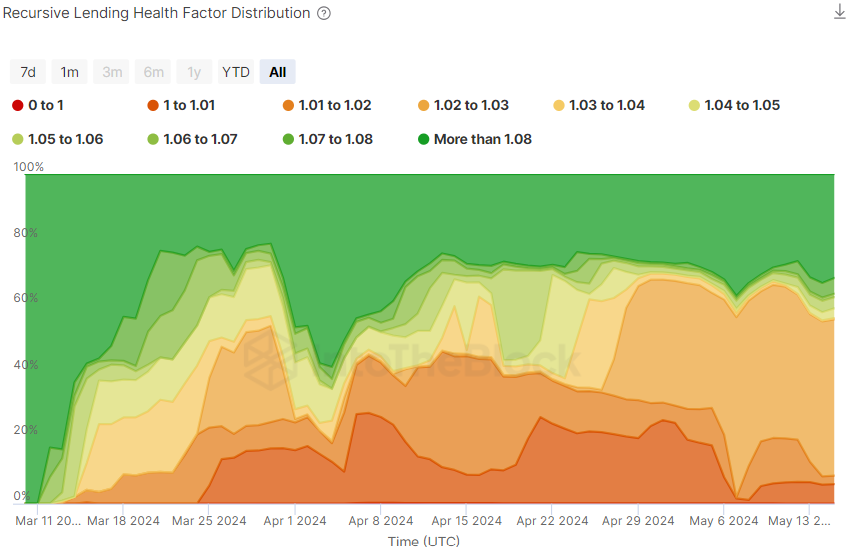 The Recursive Lending Health Factor Distribution tracks these values specifically for those rehypothecating their loans, or "looping", back into the protocol. Since this type of loan borrows and deposits the same asset, it can handle a much lower health factor without imminent liquidation risk, which is why there are two separate versions of this indicator.